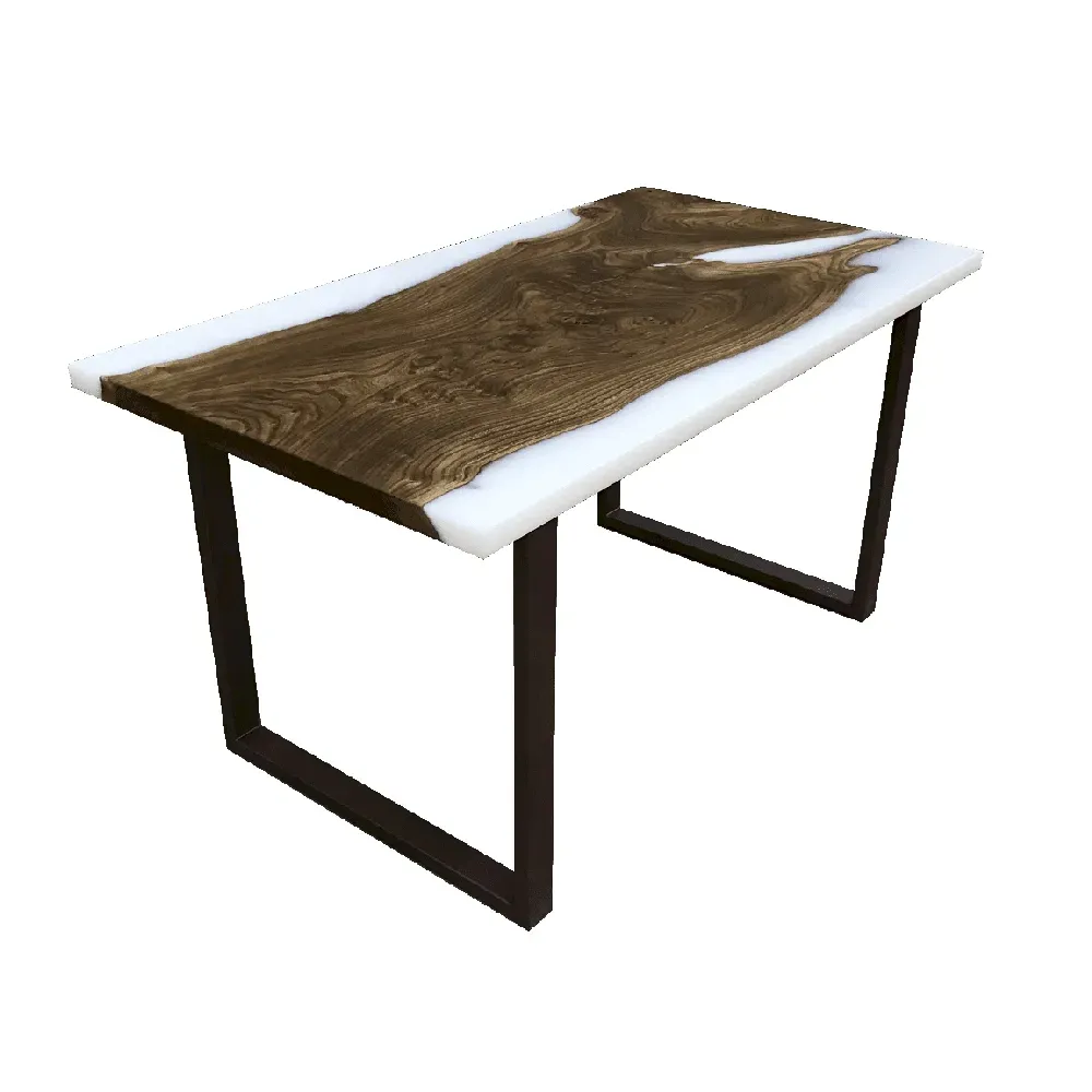 За основу изделия взят эксклюзивный слэб массива горного вяза, облитый вокруг эпоксидной смолой белого цвета. Поверхность столешницы имеет идеально гладкое покрытие, касаясь которого будут появляться только положительные и приятные эмоции. Тепло дерева в каждом прикосновении!!! Финишное покрытие столешницы выполнено водным лаком. Толщина столешницы составляет 40 мм. Основание изготовлено из металла....